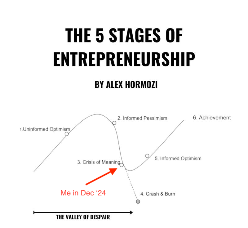 Around the same time, I came across Alex Hormozi, unconventional business coach and founder of Acquisition.com. In one of his videos, he talked about “The 5 Stages of Entrepreneurship” and explained them using the graph above. Suddenly, my perspective on the path that I had taken started shifting.